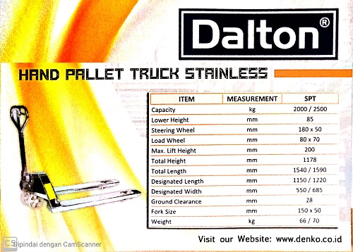 • Hand Pallet / Hand Jack / Handlift  DALTON Stainless Steel Capacity 2.000 kg dan 2.500 kg